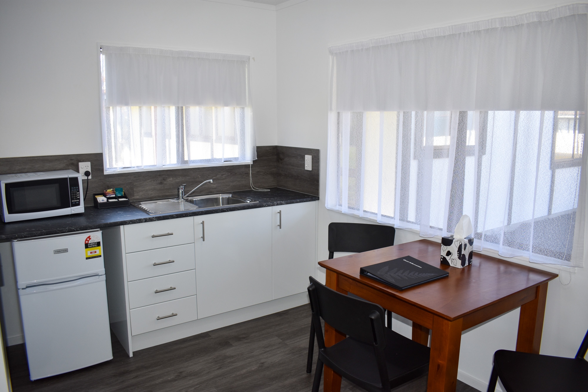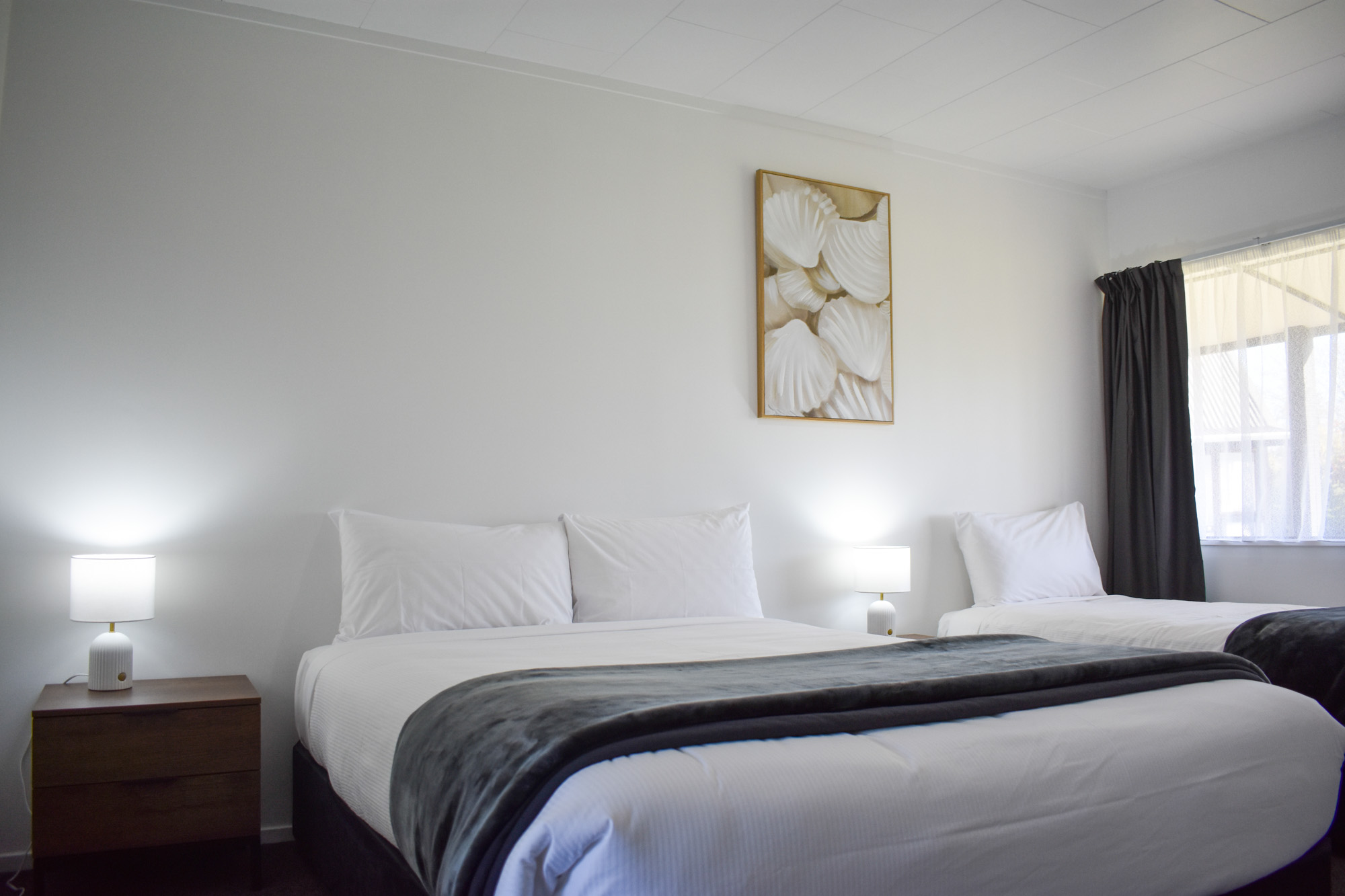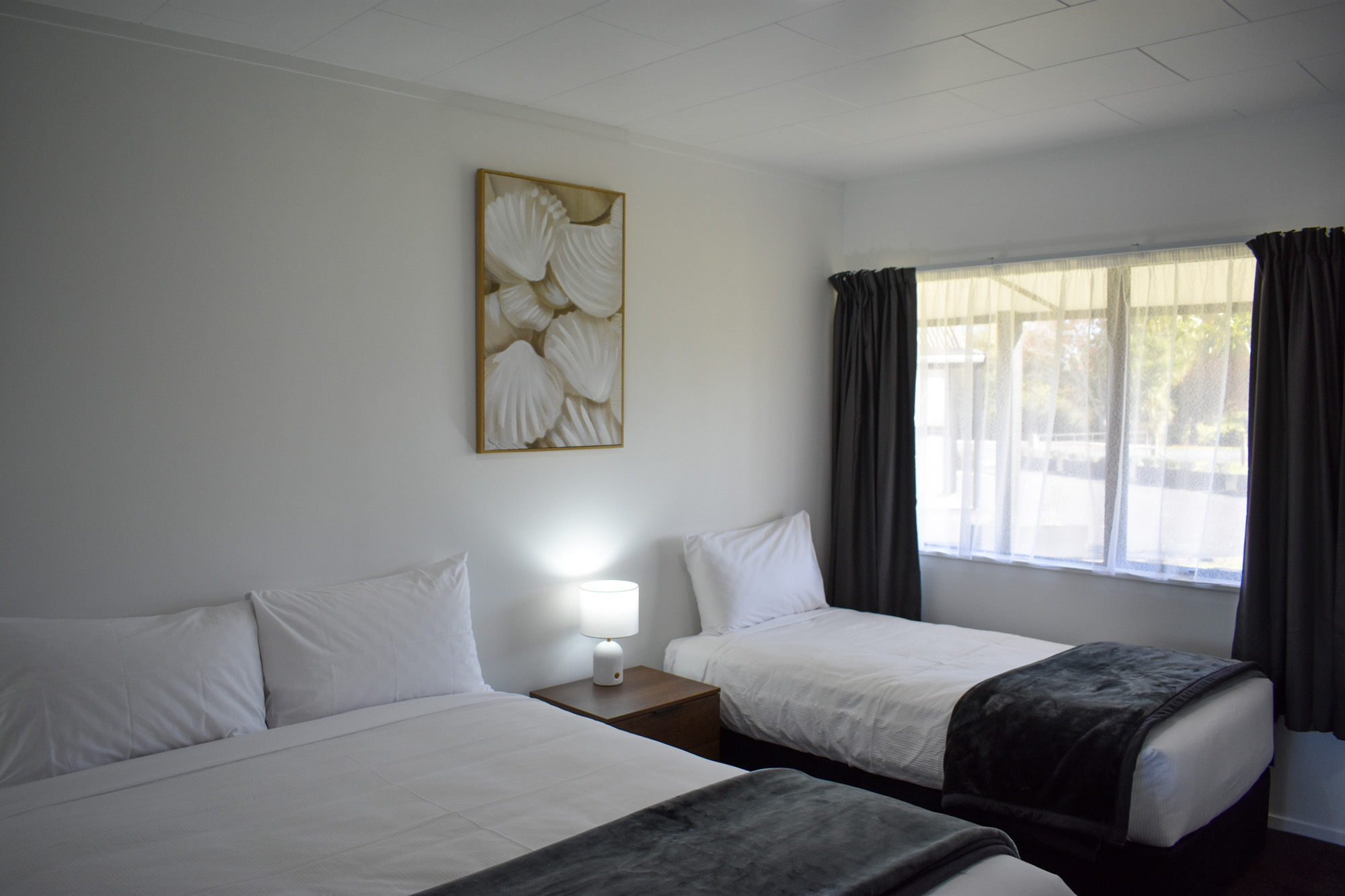 These comprise of 1 Queen bed and 1 single bed in the bedroom and 1 single bed in a spacious lounge or 2 single beds in the bedroom and 1 Queen bed in the lounge, 32” LED flat screen TV, bathroom with shower, a kitchenette and complimentary unlimited Wi-Fi. A wheelchair accessible room is available.